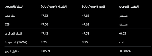 وفقاً لآخر تحديثات البنك المركزي المصري والبنوك الرئيسية:البنك المركزي: 47.45 جنيه للشراء، 47.58 جنيه للبيع (انخفاض طفيف بنحو 0.05 جنيه عن اليوم السابق).