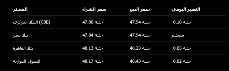 بناءً على آخر تحديثات البنك المركزي المصري (CBE) والبنوك الرئيسية، شهد سعر الدولار الأمريكي تراجعاً طفيفاً مقابل الجنيه المصري اليوم، حيث بلغ في السوق الرسمي حوالي 47.80-47.94 جنيه.