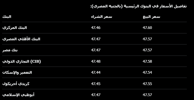 وفقًا لبيانات البنك المركزي المصري، سجل سعر الدولار 47.46 جنيه للشراء و47.60 جنيه للبيع، بينما يتراوح في السوق السوداء بين 47.80 و48.10 جنيه حسب الطلب والعرض.تفاصيل الأسعار في البنوك الرئيسية (بالجنيه المصري):