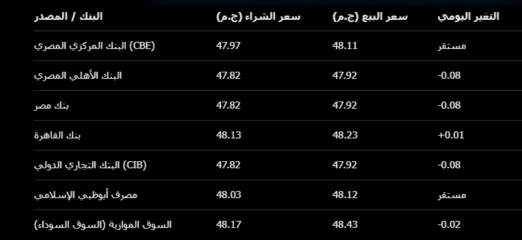 متوسط السعر في البنوك: حوالي 48.00 ج.م للشراء و48.10 ج.م للبيع، مع استقرار نسبي بعد تراجع طفيف أمس.