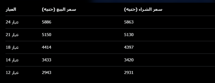 أما عيار 24، الأعلى نقاءً، فقد بلغ 5886 جنيهاً للبيع و5863 جنيهاً للشراء، بينما عيار 18 وصل إلى 4414 جنيهاً للبيع و4397 جنيهاً للشراء.