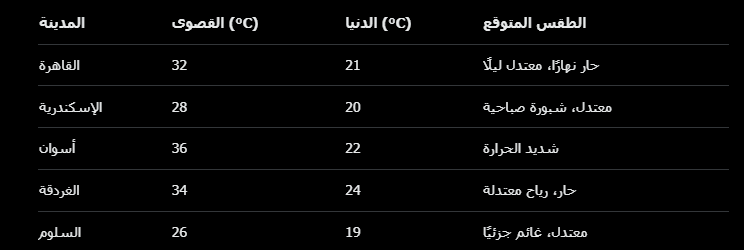 جنوبًا، في أسوان، ترتفع الحرارة إلى 36 درجة قصوى و22 درجة دنيا، مما يجعل الطقس شديد الحرارة في الصعيد.