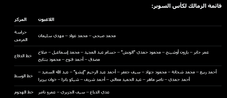 يلي هذا التدريب جلسات يومية أخرى حتى المباراة، بعد فحوصات طبية أولية أمس.أعلن عبد الرؤوف قائمة الفريق لبطولة السوبر، التي استبعدت ثلاثة عناصر فقط، مع إدراج البرازيلي خوان بيزيرا رغم غيابه السابق بسبب الإصابة، لدعم الخط الهجومي.