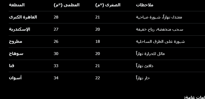تشير الهيئة إلى بداية انخفاض تدريجي في درجات الحرارة، خاصة ليلاً، مع طابع خريفي واضح. ودعت إلى متابعة النشرات الجوية لتجنب تأثيرات الشبورة أثناء القيادة، وارتداء ملابس مناسبة في الصباح الباكر والمساء.