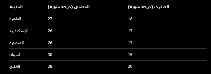 درجات الحرارة المتوقعة في المدن الرئيسية: