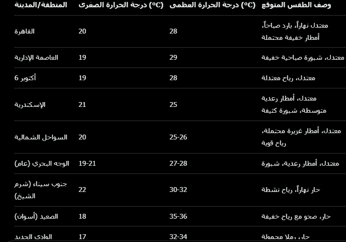 إليك جدولاً يلخص الدرجات المتوقعة للحرارة (الصغرى والعظمى) في المدن والمناطق الرئيسية، مع وصف الطقس العام: