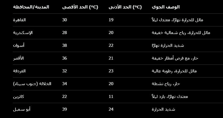 هذه التوقعات مبنية على بيانات هيئة الأرصاد الجوية المصرية، مع الإشارة إلى أن الطقس الخريفي يبدأ في الظهور تدريجيًا، لكن الحرارة لا تزال مسيطرة في الجنوب.