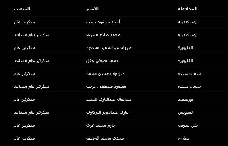كما تضمنت الحركة ترقية للدرجة العالية لـ5 قيادات: محمد عبدالحميد مرعي (سكرتير عام مساعد الجيزة)، أسامة رزق منصور (مساعد البحيرة)، خالد إبراهيم النمر (مساعد المنوفية)، أحمد محمد جمال الدين (مساعد بني سويف)، وإيهاب محمد رشاد (مساعد جنوب سيناء).