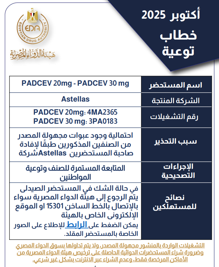 حذرت هيئة الدواء المصرية من عبوات مجهولة المصدر لحقنة “بادسيف” (20 و30 ملجم)، المستخدمة لعلاج سرطان المثانة المتقدم، بعد رصد تشغيلات مزيفة (4MA2365 و3PA0183) غير مرخصة في السوق.
