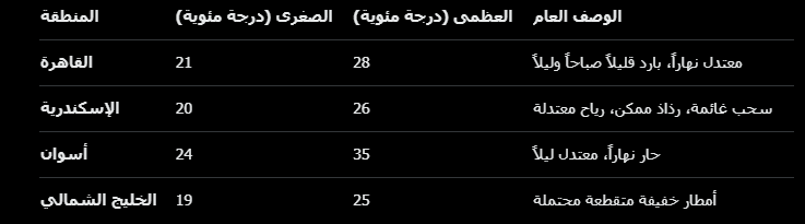 بناءً على توقعات الهيئة العامة للأرصاد الجوية المصرية ومصادر دولية مثل AccuWeather وArabiaWeather، يشهد الطقس اليوم في القاهرة طقساً خريفياً معتدلاً نهاراً، مع انخفاض طفيف في درجات الحرارة مقارنة بالأيام السابقة.
