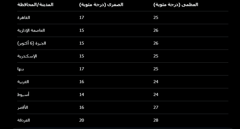 وفقاً لهيئة الأرصاد الجوية، إليك درجات الحرارة المتوقعة (الصغرى/العظمى) في أبرز المدن والمحافظات:
