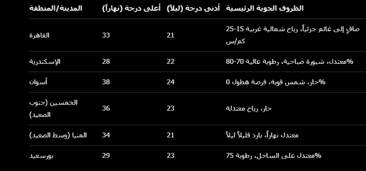 الرياح والرطوبة: الرياح النشطة على معظم الأنحاء قد تخفف من الإحساس بالحرارة، لكن الرطوبة في الدلتا والسواحل قد تصل إلى 80%، مما يزيد من الشعور بالدفء.