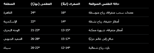 في القاهرة والدلتا، تتراوح درجات الحرارة العظمى بين 22 و24 درجة مئوية نهارًا، والصغرى بين 12 و16 درجة مئوية ليلاً، مع رطوبة تصل إلى 60% ورياح شمالية غربية متوسطة السرعة (10-20 كم/ساعة)، قد تثير الشبورة المائية على الطرق.