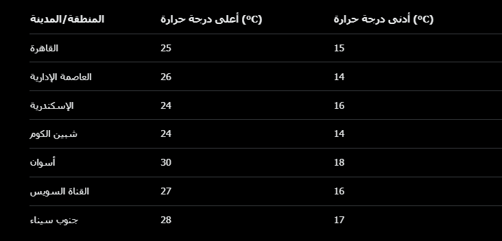 جنوب الصعيد: حار نسبيًا (حتى 30 درجة)، مع انخفاض تدريجي.