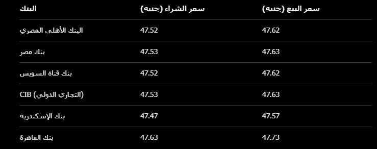 وفقًا لبيانات البنك المركزي، بلغ سعر الدولار 47.49 جنيه للشراء و47.63 جنيه للبيع، مما يعكس فارقًا بسيطًا يتراوح بين 0.10 إلى 0.14 جنيه بين البنوك.