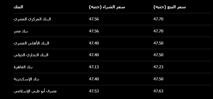 في السوق السوداء، يصل السعر إلى حوالي 47.80-48.00 جنيهًا، لكن يُنصح بالتعامل عبر البنوك الرسمية لتجنب المخاطر.