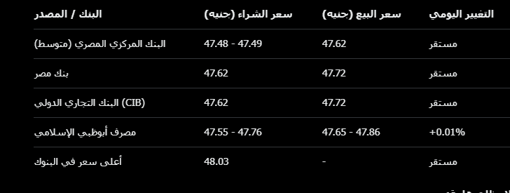 وفقاً لآخر التحديثات من البنك المركزي المصري والبنوك، يتراوح السعر بين 47.48 و48 جنيه تقريباً، مع فروق طفيفة بين الشراء والبيع.
