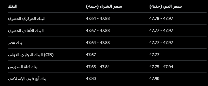 المتوسط العام: حوالي 47.70 جنيه للشراء، و47.80 جنيه للبيع، مع فارق يصل إلى 0.10 – 0.20 جنيه بين الشراء والبيع.