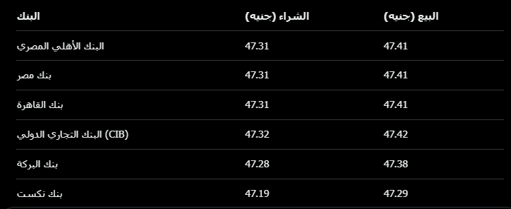 وفقاً لبيانات البنك المركزي المصري، سجل سعر الشراء 47.30 جنيهاً، وسعر البيع 47.44 جنيهاً.