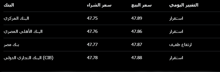السوق السوداء: حوالي 48.00 – 48.20 جنيه (غير رسمي، يتفاوت حسب المعاملات).