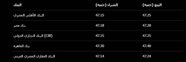 وفقًا لآخر التحديثات من البنك المركزي المصري، سجل سعر الشراء 47.11 جنيهًا، وسعر البيع 47.24 جنيهًا.