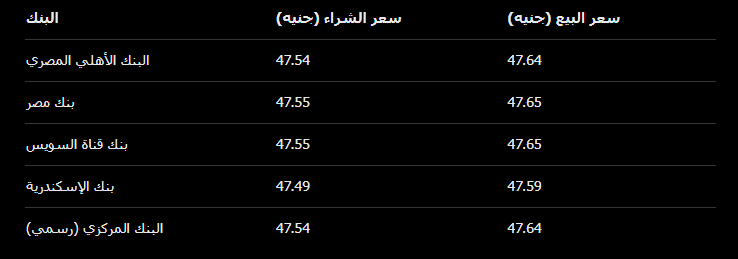 في شركات الصرافة والسوق السوداء: يتراوح السعر بين 47.60 و47.70 جنيه للبيع، مع فارق طفيف يعكس الطلب المحدود نهاية الأسبوع.