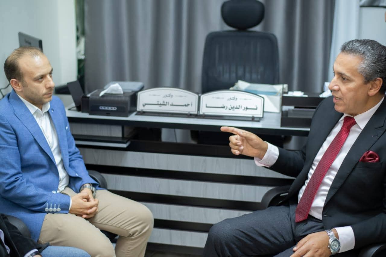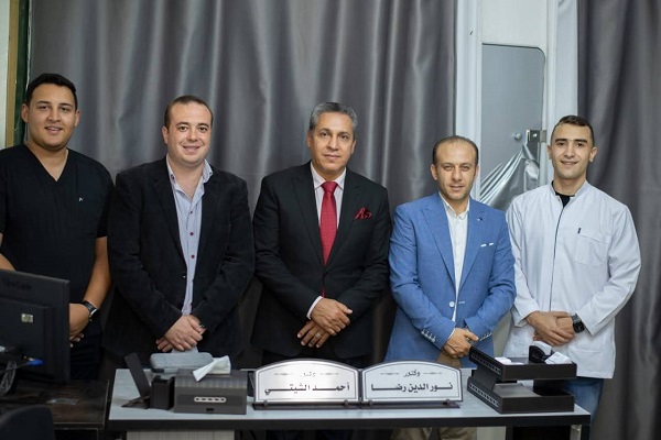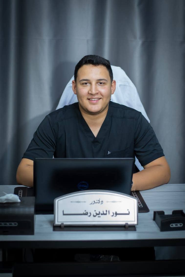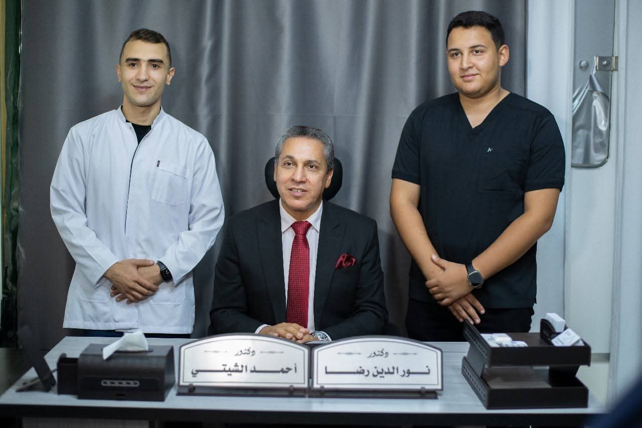 عيادة ابنه الاكبر الدكتور نور الدين رضا بالتعاون مع زميله الدكتور احمد الشيتى فى تخصص طب الاسنان بمدينة المنصورة شارع الدراسات الاسلامية برج نجمة الدراسات اعلى صيدلية الهلال