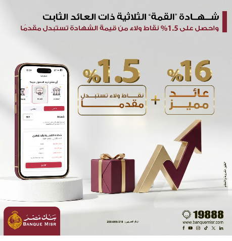 أطلق بنك مصر عرضًا ترويجيًا جديدًا لفترة محدودة على شهادة «القمة» الثلاثية، يمنح العملاء 1.5% من قيمة الشهادة في صورة نقاط ولاء مقدمة عند الشراء أو عند التجديد، في خطوة تستهدف تعزيز جاذبية الأوعية الادخارية وتقديم مزايا إضافية تتجاوز العائد التقليدي.