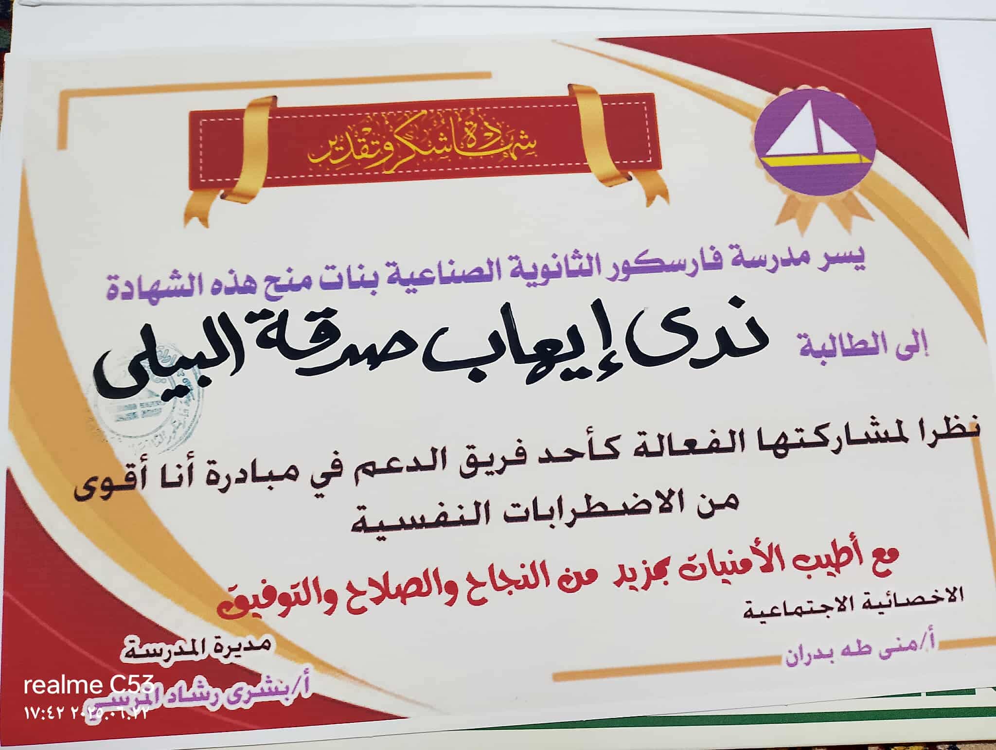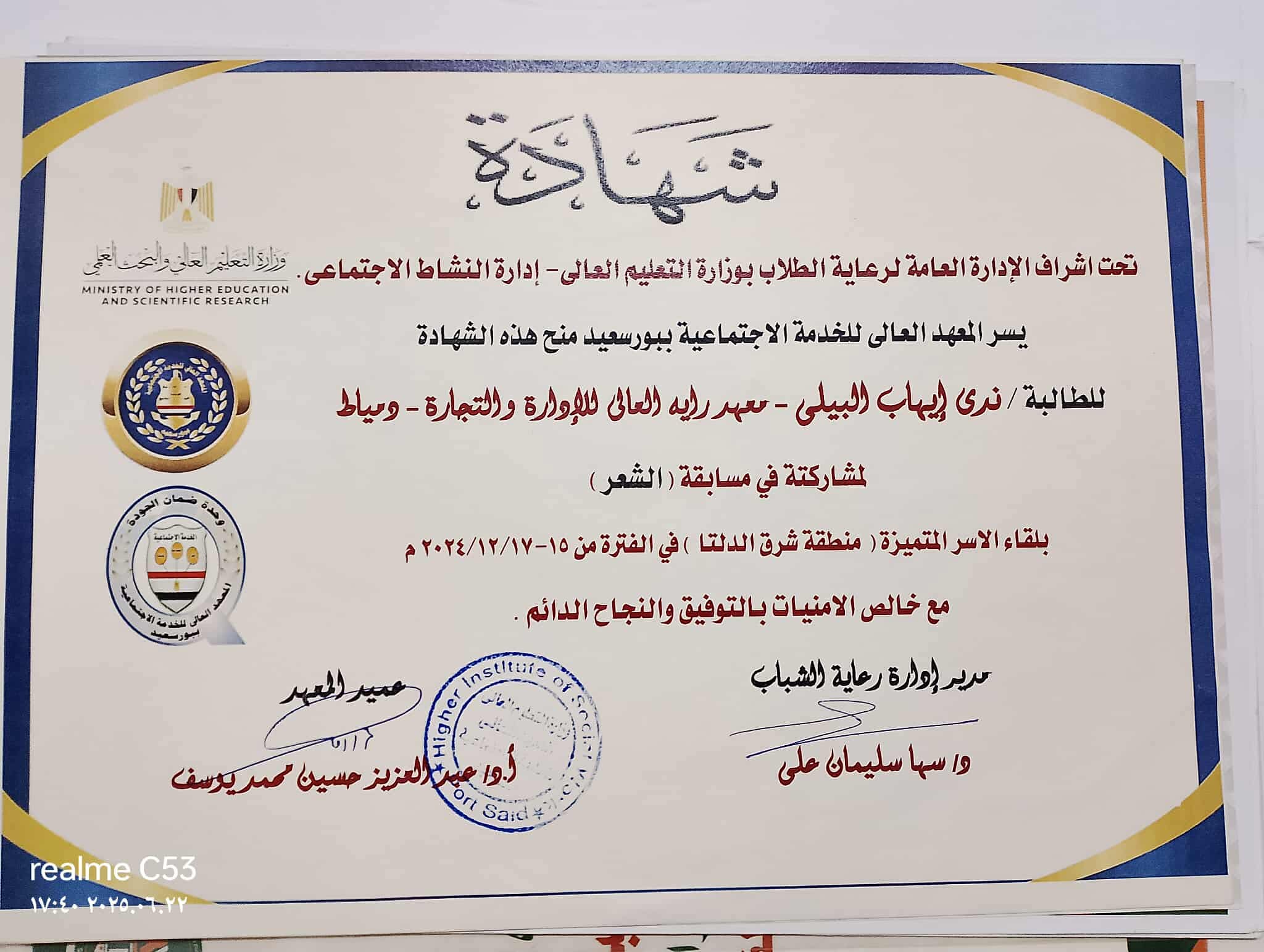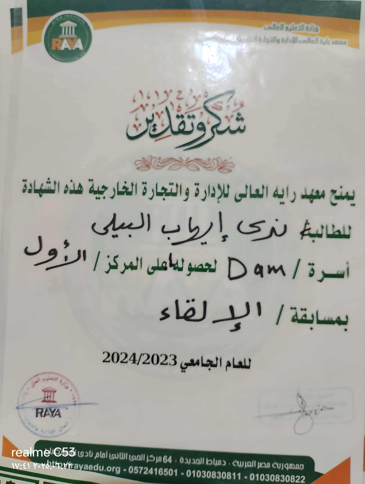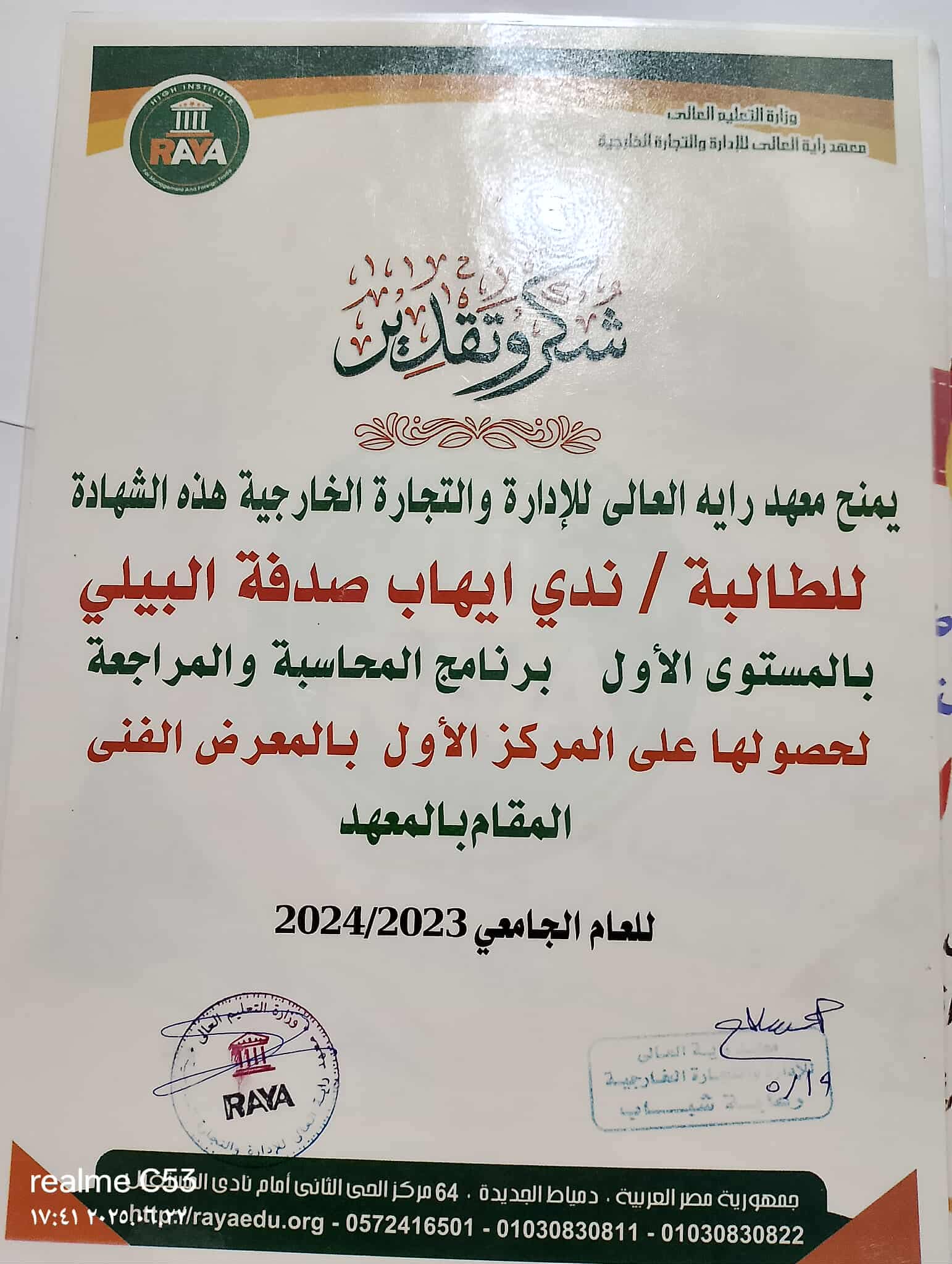 20 عام طالبة فى معهد راية للادارة والتجارة الخارجية